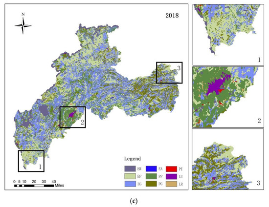 (a–c) represent the spatial distribution of PLE space in 2010, 2015, and 2018, respectively.ER is restricted ecological space. EP is priority ecological space. EG is general ecological space. EA is accommodated ecological space. PP is priority agricultural production space. PG is general agricultural production space. PI is industrial production space. LU is urban living space. LR is rural living space.