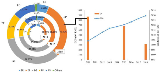 In terms of changing trends, the ecological space area decreased from 2010 to 2018 but not significantly. Figure 6 shows that between 2010 and 2018, Zhaotong’s GDP continued to increase, while at the same time, the space for priority ecological space continued to decrease. Conversely, production space decreased significantly from 6031 km2 in 2010 to 6000 km2 in 2018, which was mainly due to the decrease in general agricultural production space. There was a clear trend of growth in living space, from 194.67 km2 in 2010 to 232.97 km2 in 2018, with an increase of approximately 20%. This increase is mainly due to the expansion of urban living space, which was only 40.78 km2 in 2010, reaching 72.76 km2 in 2018, with an increase of approximately 78%.