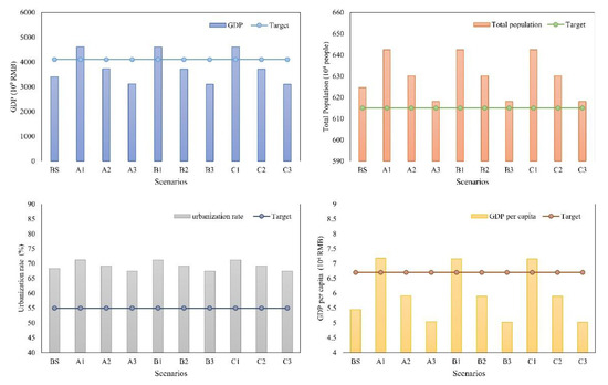 Based on the constructed SD model of PLE space, the simulated values of the main variables under different scenarios in 2030 were obtained, as shown in Table S18. This result indicates that under the base scenario, the regional GDP is 340.508 billion yuan by 2030, with a total population of 6,245,700 people, the GDP per capita of 54,500 yuan, and an urbanization rate of 68.33%. This means that under the base scenario, the regional GDP and GDP per capita cannot meet the planning target, although the population and urbanization rate can.