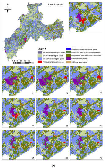 The future demand area of different land types needs to be proportionally converted to the number of land parcels in the FLUS model for spatial simulation. The gap between the actual allocation of parcels and the demand parcels is also presented in Table S19. In the base scenario, the expansion of rural living space far exceeds the planned demand by approximately 38%. In contrast, the number of allocated parcels of industrial production space differs from the number of demands by −22.63%, which means that it does not meet the target. In Scenario A1, 25.37% of the urban living space does not meet the future demand in the spatial configuration. In Scenario B1, neither urban living space nor industrial production space meets future needs; for example, the gap in urban living space is −22.14%. This is more obvious in Scenario C1, where 55.23% of the urban living space does not meet the demand.
