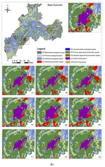 International academic research has discussed food security [23], tourism [24], agriculture [25], and urban regeneration [26] under the background of urban sustainability but rarely focuses on PLE space. After all, the concept has been proposed by the Chinese government in the context of China. Most studies are conducted on a domestic scope. Huang et al. claimed that the assessment of regional spatial carrying capacity and suitability is an important guideline for PLE space optimization [20]. Wu et al. indicated that the carrying capacity determines the upper limit of the PLE space in quantity, while suitability evaluation is related to the spatial layout structure [27]. Some studies have provided qualitative and empirical optimization suggestions based on the results of the carrying capacity and suitability evaluation [28,29,30]. In general, the suggestions point out that rules and regulations should be further enhanced and technology standards need to be improved in the future. However, it is uncertain whether these suggestions are feasible and effective. It is necessary to develop quantified and visualized tools to simulate future scenarios, especially for policymakers who face the difficulty of applying social and ecological approaches to decision-making [31].