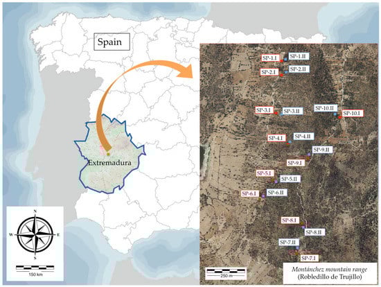 This study was located in the Montánchez mountain range, located in the south of the province of Caceres, in the municipality of Robledillo de Trujillo (2000 inhabitants in 1950; 360 in 2020 [], Extremadura, Spain. (39°16′10.43′′ N–5°58′49.34′′ W) (Figure 1).