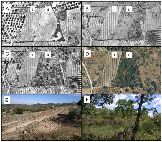 As an example, evolution of the soils of the two sampling points; I: location considered permanent cultivated soil (CS); II: location considered abandoned agricultural soil (AS). (A) Aerial picture (1956). (B) Interministry orthophoto (1976). (C) Orthophoto SIG Oleícola (1998). (D) Satellite image SIGPAC (2016). (E) Current picture of point 1.I (2020). (F) Current picture of point 1.II (2020). (Source: images gathered from IDEE and own source).