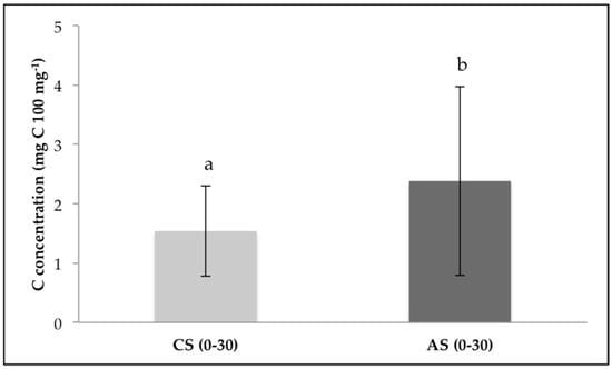 Comparison between the values of C concentration (mg C 100 mg−1) in the first 30 cm of cultivated soils (CS) and abandoned soils (AS); a, b: different letters indicate significant differences (Student’s t-test of paired samples, p < 0.05).
