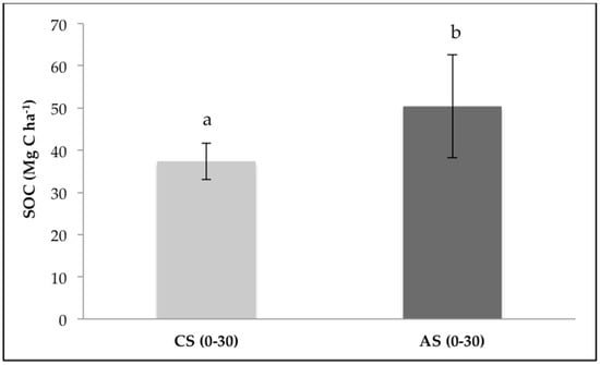 Comparison of the values of total soil organic carbon (SOC) (Mg C ha−1) in the first 30 cm between cultivated soils (CS) and abandoned soils (AS); a, b: different letters indicate significant differences (Wilcoxon’s test, p < 0.05).