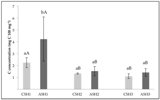 Values of C concentration (mg C 100 mg−1) in each horizon (H1: 0–10 cm; H2: 10–20 cm; H3: 20–30 cm) of cultivated soils (CS) and abandoned soils (AS). Different small letters indicate significant differences between the same horizon of different land use (Student’s t-test for paired samples, p < 0.05). Different capital letters indicate significant differences between different horizons with the same land use (ANOVA test, p < 0.05).