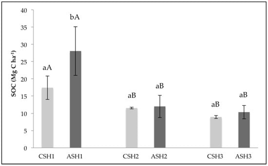 It is important to highlight that, in all horizons, both C concentration and SOC were higher in AS than in CS, although such differences were only significant in the most superficial horizon (H1) (Figure 5 and Figure 6) due to an entry of organic matter from the decomposition of the plant necromass in the upper horizon. The lack of significant differences at depths below 10 cm seem to indicate that the stabilization of the carbon in lower horizons is slow, as already demonstrated by other authors [,,]. Furthermore, there was also a progressive and significant decrease of C concentration along the profile in both land uses (Figure 5). The AS, i.e., those with a plant coverage, had a greater and more stable C concentration at greater depth compared to CS. The SOC showed the same behavior, with significant differences between the first 10 cm and the rest of the profile (Figure 6).