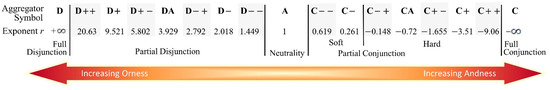Logic scoring of preference (LSP) logic aggregators with associated symbols and r exponent values.