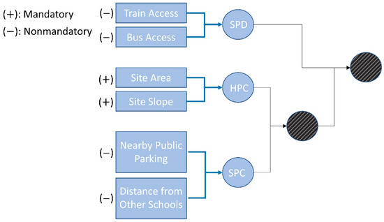 A hypothetical example of LSP-based site selection for a new college location is shown in Figure 2. Mandatory criteria, such as a sufficient site area and an appropriate slope, are combined using an HPC aggregator. Referencing Figure 1, this can be any aggregator from C−+ to C++, depending on the level of ANDness or simultaneity desired. An SPC aggregator is likewise applied to desired criteria where both are wanted but a location is not automatically rejected if either is unsatisfied (e.g., distance from other schools, availability of nearby parking). Finally, an SPD aggregator is assigned to desired criteria where replaceability is being modeled. The disjunctive aspect allows for train and bus access to partially substitute for the other, while the soft aspect enables rewarding of locations that offer both.