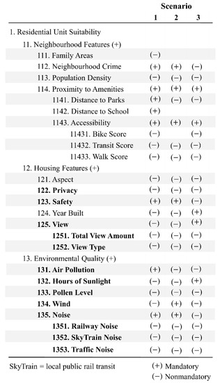 In this research, the decision problem consists of identifying the most suitable high-rise residential units for prospective residents. LSP attributes and 3D preference scenarios can be developed for various groups and stakeholders, including real-estate tax assessments, urban planners, and developers. For this study, three generalized sociodemographic groups were chosen with characteristics based on existing scientific literature: families with children (Scenario 1), elderly (Scenario 2), and working professionals (Scenario 3). Many 3D attributes, defined here as attributes whose values are affected by the vertical location of the unit, were included as factors that need to be considered in high-rise home selection in addition to the typical 2D factors and amenities. Ultimately, 10 2D and 11 3D elementary attributes influencing residence selection were identified and included in Scenario 1, three of which were omitted from either Scenario 2 or 3. The attribute trees presented for each scenario in Figure 3 are composed of three overarching attribute groups: neighborhood features (11), housing features, and (12) and environmental quality (13). The figure also distinguishes between attributes that are mandatory and nonmandatory and those that are 2D or 3D for each scenario.