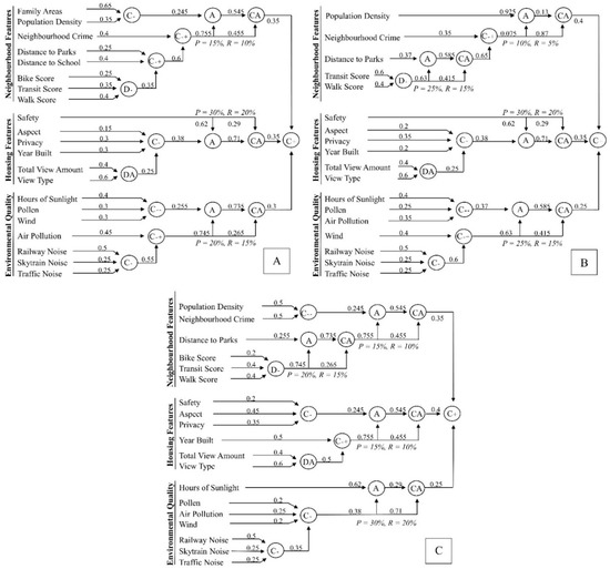 The LSP aggregation structures created for the three scenarios are depicted in Figure 4. An SPD aggregator is applied to the accessibility aggregation block (node 1143 in Figure 3) to indicate that walk, bike, and transit score criteria are replaceable to an extent, but a higher satisfaction degree is awarded to locations that satisfy all three. Similarly, an SPD aggregator is used for the view aggregation block (node 125) to suggest that while having both a large and desirable view is preferred, either criterion can partially replace the other. The remaining standard aggregators are either SPC or HPC, selected based on whether mandatory or desired components were being aggregated and the level of ANDness desired. For instance, an HPC aggregator is applied to aggregate the mandatory environment block (134–135) in Scenario 2 as they are mandatory requirements (Figure 4B), and C− + in particular is chosen to indicate that only a low to moderate level of simultaneity is needed. Both of the nonmandatory neighborhood (112–113) and nonmandatory housing (121–123) aggregation blocks in Scenario 3 are composed of desired components and thus require SPC aggregators (Figure 4C), but a larger ANDness (C−) is used for nonmandatory housing, denoting the demographic’s desire for a slightly higher level of simultaneity in having all of safety, privacy, and a desired aspect.