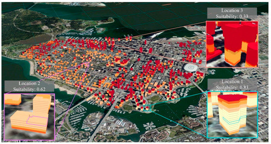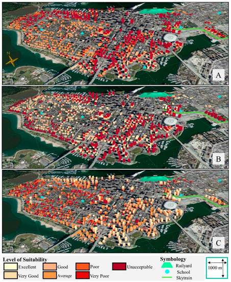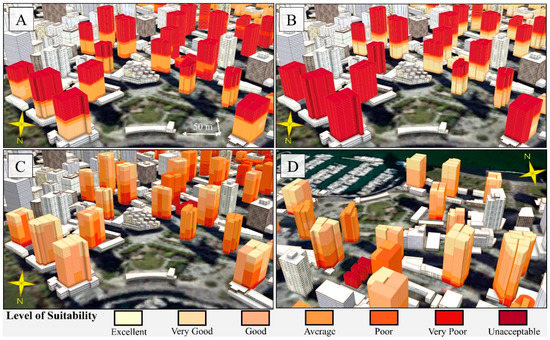The LSP criterion functions and 3D LSP–MCE suitability analyses were coded and run in CityEngine 2019.1 software [11] using the Computer Generated Architecture (CGA) programming language. The suitability scores for the 3D voxel units are presented and classified into seven equal interval classes of suitability: unacceptable (0.0–0.14), very poor (0.14–0.28), poor (0.28–0.43), average (0.43–0.57), good (0.57–0.71), very good (0.71–0.86), and excellent (0.88–1.00). Figure 5 presents the suitability analysis results for each scenario.
