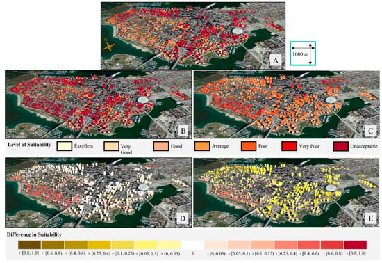 To visualize the change in results for the first two tests, 3D difference maps were created by subtracting the original Scenario 1 suitability value for each unit from the corresponding new suitability value. Figure 8 presents the results of the sensitivity analysis with the initial Scenario 1 provided in panel (A) as a reference. Contrasting suitability values for more and no mandatory attributes are found in panels (B) and (C), and the respective difference maps are shown in panels (D) and (E). The results of the third sensitivity analysis test with equal weights provide a very small change in obtained values for 3D suitability ranging from −0.12 to +0.05, which can be explained by the aggregation block components in Scenario 1 not having extreme differences for weights.