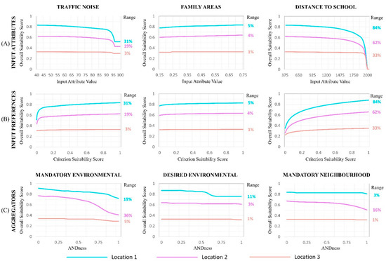 In addition to performing the 3D LSP–MCE suitability analysis, the sensitivity of parameters was tested by modifying parameters for Scenario 1 using four separate test scenarios and by comparing the obtained results. The first sensitivity test involved increasing the number of mandatory attributes for Scenario 1, namely, family areas, population density, privacy, and pollen. The second test removed all mandatory attributes from Scenario 1 such that all attributes were desired. The third test weighted all components within each aggregation block in Scenario 1 equally. Finally, the last test implemented a one-at-a-time approach by incrementally increasing the input elementary attribute and elementary preference values for three elementary criteria (traffic noise, family areas, distance to schools) and the ANDness of aggregators for three aggregation subgroups (mandatory environmental, desired environmental, mandatory neighborhood) at three residential unit locations (Figure 7) to derive sensitivity curves and influence ranges.
