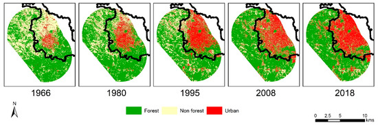 The satellite image classification of forest cover for all the studied periods had an overall accuracy (i.e., concordance index) of more than 90% between the points verified in the field and the image classification. During the 52-year-period (1966–2018; Figure 2), the net area of forest lost was 1092 ha, with a total annual deforestation rate of −0.004%. Urban area expansion went from 690 ha to 3290 ha. The 1966–1980 period displayed the lowest loss of forest cover (151.23 ha), even though it comprised 14 years. In contrast, the most significant loss of forest cover (513.56 ha; Table 2) occurred between 1980–1995 (15 years).