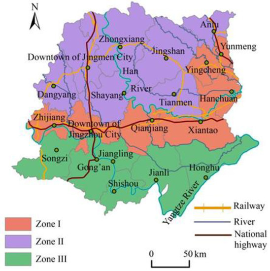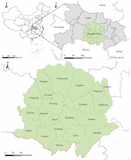 The Jianghan Plain, the case study for this research, is located in the middle reaches of the Yangtze River and at the central–southern part of Hubei Province (Figure 2). In the National Principal Functional Zoning Plan, the Jianghan Plain is designated as one of the country’s main agricultural production regions. It is also a traditional agricultural region in Central China with a large rural population. Its population in 2018 was 15.60 million, of which the rural population accounted for 43.07% (672 million). Agricultural production holds a special status, with the total regional output being valued at RMB 845 billion during the same period. The added value of the primary industry was RMB 121 billion, accounting for 14.33% of the total. Rural revitalization of the plain is of great significance to the country’s food security and the rise of Central China. The Jianghan Plain constitutes an appropriate case study subject, being one of the main agricultural production regions in the country; moreover, it represents the rural development of agricultural regions in Central China well.