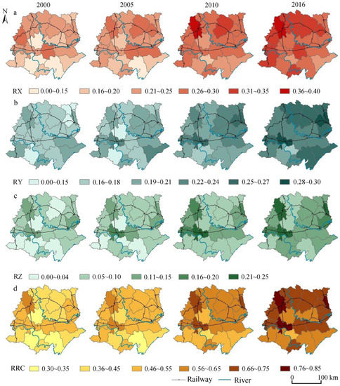 Following Section 2.2.1, the entropy method was used to obtain the weights of the various indices in Table 1 (Endogenous responses). Next, the dimensional and comprehensive indices for the rural reconstruction of the Plain were calculated through summation of the weights. The results, as shown in Table 2, indicate the following: (1) the rural areas of the Plain were undergoing a process of continuous reconstruction. In 2000–2016, the RRC increased from 0.10 to 0.79, while the RX, RY, and RZ increased from 0.05, 0.04, and 0.01 to 0.28, 0.23, and 0.28, respectively. During the study period, the proportion of rural population decreased from 66.68% to 47.12%, whereas the pro-portion of non-agricultural industries rose from 74.13% to 90.58%, and the proportion of urban construction land increased from 0.91% to 1.52%. Overall, the rural areas elements and system structure had undergone dramatic changes. (2) Rural reconstruction of the Plain was characterized by a phased development, with 2009 roughly being the node. RX’s contribution rate rose in the early stage but declined steadily in the later stage; RY’s contribution rate decreased significantly in the early stage but remained relatively stable in the later stage; and RZ’s contribution rate fluctuated in the early stage before rising steadily in the later stage. The evolutionary process of rural reconstruction was in the sequence of social, economic, and spatial restructuring. The Plain experienced rapid industrialization and urbanization in the 21st century, causing the rural areas to experience an evolutionary process with changes to the population structure, industrial structure and land use structure in sequence [47]. There was a general coincidence between the phased characteristics of rural reconstruction and the trend of evolution in the rural space.