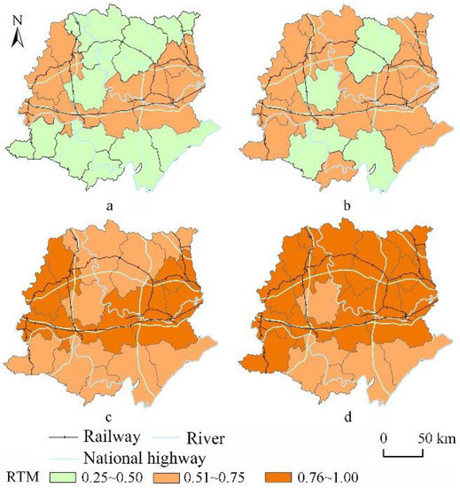 Following Section 2.2.2, the RCF, RBF, and RTM of the plain in 2000 and 2016 were calculated at the county level. The results, shown in Figure 4, indicate that the spatiotemporal map of rural transformation was largely consistent with that of rural reconstruction. Temporally, there were still 10 counties (including Jingshan County) with an RTM < 50% in 2000, and where agricultural functions were still dominant. By 2016, all the counties had an RTM > 50%, indicating that agricultural functions had been degraded to a non-primary role and that the rural areas had undergone stable transformation. From a spatial perspective, the 10 counties that underwent rural transformation (RTM > 50%) in 2000 showed a U-type distribution pattern along the railways located in the west, south, and east. The rural functions in the northern area and along the Yangtze River in the south were still predominant. By 2016, all the counties had undergone rural transformation. With completion of the Changjing Railway’s high-speed transformation and operational launch in 2012, areas with high RTM values (>75%) gradually formed an O-type distribution in the northern–central part. The low RTM values (≤75%) were located in the south along the Yangtze River and at the central hinterlands.
