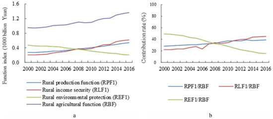 Index and contribution rate changes of rural comprehensive and production, living and ecological function in Jianghan Plain from 2000 to 2016. (a) indexes of rural agricultural function and sub-function, (b) contribution rates of the sub-function of rural agricultural function.