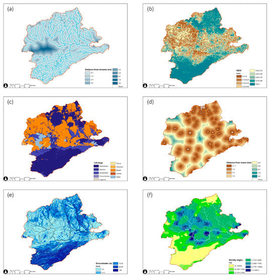 (a–f) Essential parameters: (a) distance from streams; (b) NDVI; (c) lithology; (d) distance from towns; (e) groundwater; (f) salinity.