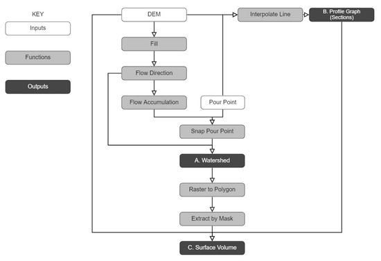 By inputting a Digital Elevation Model (DEM) and potential pour points into the GIS environment to simulate the hydrological system. This workflow model the flow network and hierarchy of a pre-defined site by calculating the raster’s flow direction and flow accumulation [34]. Snapping pour points is a necessary procedure for computing the watershed, which is combined with the profile graph of pour points to produce a value for the volume of water stored through surface volume. Note that two parameters will affect the final volume result, one is the planned height as the original terrain height plus the proposed dam height (determined by the whole depth of the profile), and the other is the selection below the reference plane.