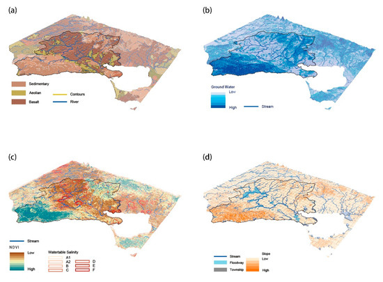 According to the information compared in Figure 6, it is concluded that the Barwon area ecological landscape has the following characteristics: (1) The terrain throughout the study area gradually changes from a forested plateau in the southwest to the northern plains. The space between the canyons is conducive to the convergence of water and guides its direction, which provides a topographical difference for the catchment area. Compared with the mapping of land types, lithology intuitively shows that most of southern Barwon is sedimentary and aeolian soil types. This property enhances water permeability and groundwater retention. In contrast, the central basin of the mainstream is composed of basalt (complex rock formations) in the north and extends towards the sedimentary rock plain (Figure 6a,b), which suggests that the hardness of the land may influence the direction of the flow; (2) NDVI values in areas of high salinity show a negative performance (Figure 6b,c). However, its role as an indicator of the healthy growth of vegetation typically fluctuates with dry climates and reduced precipitation, where farmlands and grasslands, the most crucial type of production occupying the Barwon region, are particularly impacted [56,57]. Plant rhizomes can also contribute to the consolidation of groundwater sources and become a buffer zone between humans and nature, thus increasing the space for water resilience; (3) The gently sloping central plain is a floodplain for seasonal inundation and is partly adjacent to towns (Figure 6d). Streams and settlements are interdependent, and the distances between them tend to be in a relatively stable ecological environment. Because the cleanliness and safety of water storage have been proven to be highly linked to the distance between water flows and communities, and as human activity has been converting large vegetated areas into productive land with the expansion of coastal development, the quality of water sources close to built-up areas is vulnerable to human intervention.