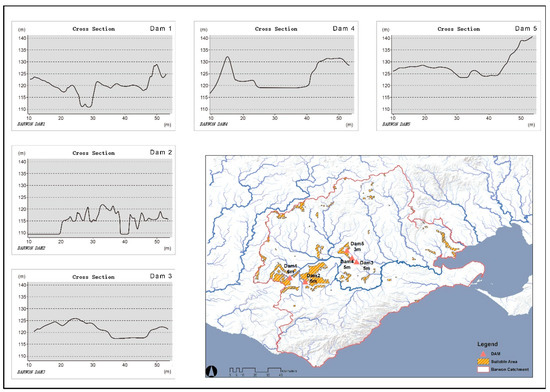 Five ecologically resilient areas are proposed for dam site testing and selection based on weighted calculations, with the overall objective being to alleviate water scarcity in the dry season and serve traditional agricultural activities. The dams and wetlands can be used as a cushion between humans and nature to regulate stream volumes when extreme precipitation increases during the flood season. In particular, in periods of abnormal water levels, dams are utilized to suppress runoff and redistribute it to other times of the year [54]. As shown in Figure 8, they are located within the high suitability areas of the synthetic map and mainly around the middle and lower reaches. The simulated dam locations are input into a spatial analysis platform (GIS) as pour points to create scenarios that intercept the water flow, and a cross-section of the terrain is viewed in the built-in 3D function to provide a reference dam height for the following estimation of storage capacity. It is proposed that hierarchical dams in plain regions should not be too high to prevent overflow during the rainy season, which requires the fundamental condition that their structures are lower than the hills on either side. More specifically, for the first dam, its valley floor is shown in the profile as about 113 m, while the height of the abutting cliffs is approximately 121 m. Based on these requirements and allowing for sufficient safety margins, this dam is most suitable at a maximum height of 6 m. The five sites are tested in sequential order, and their heights are 6 m, 5 m, 5 m, 5 m and 3 m, respectively.