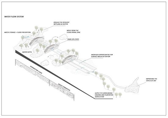 A brief estimate of the enhancement of the water supply system can be obtained by summing the total capacity of the Barwon (98,628 ML) and the additional volume provided by the envisaged multi-stage dam (49,373 ML), divided by the original water storage capacity, resulting in an improvement of approximately 1.5 times, which explains the value of the experiment. Furthermore, this diagram (Figure 9) outlines the entire mechanism of the dam’s operation, with a continuously hierarchical water storage facility that uses multiple interruptions to increase surface water retention opportunities and improve the site’s overall ecological configuration and stability. The inhabitants of the surrounding towns can extract the vital water resources from the linear system for productive activities and create a healthy habitat for living creatures. The proposed blue infrastructure provides water to support a wide range of intensive agricultural activities and creates ecological wetlands along the river to accommodate the collateral effects of future precipitation deficits.