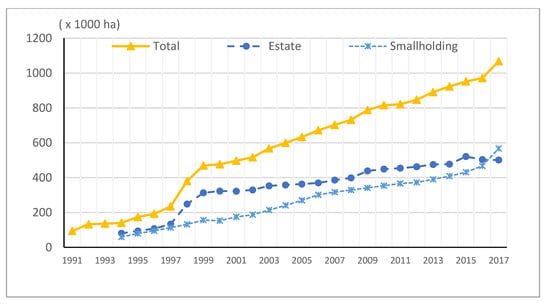 The area of oil palm plantations in South Sumatra grew from 94,186 ha in 1991 to 1,068,049 ha in 2017. During this period, the average oil palm area grew by 39.8%/year. This development period was supported by the PIR-Trans project (1986–1997), which involved private plantations as nucleus companies. At the beginning of the PIR-Trans project, the acreage of oil palm land was still slowly developing. Then, in 1997–1999 there was an explosion in the acreage of oil palm plantations of private estates, while smallholding oil palm was growing slowly, and state oil palm was relatively stable (Figure 2). The oil palm acreage of the private company increased from 106,220 ha in 1997 to 278,256 ha in 1999, i.e., it increased by 162% in two years. On the other hand, the smallholders’ plantations increased from 113,680 ha in 1997 to 156,601 ha in 1999, i.e., 38% in two years.