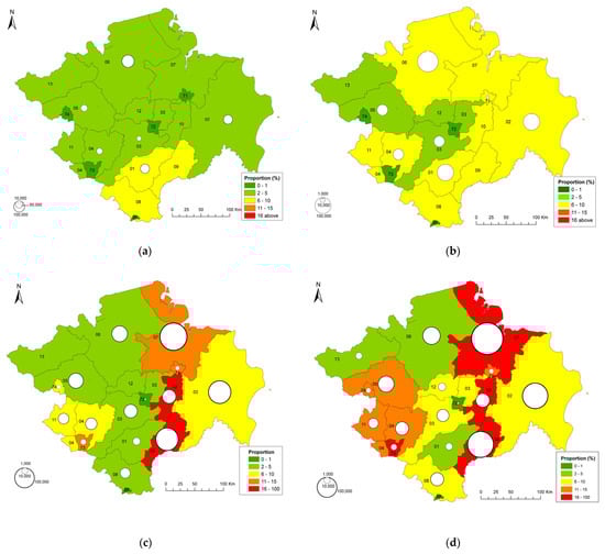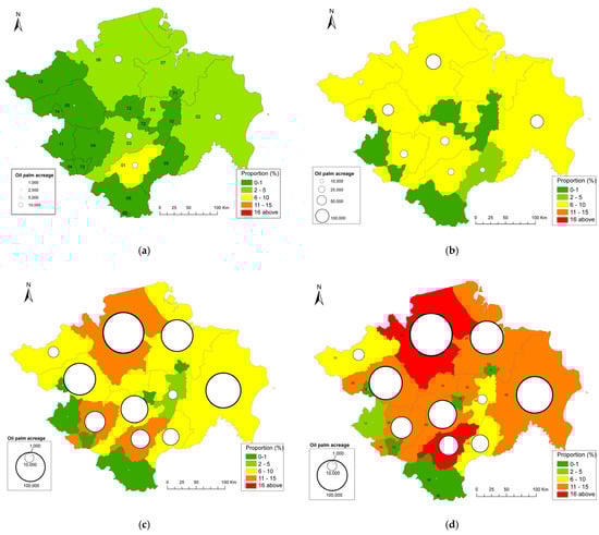 Spatial distribution of oil palm land areas in South Sumatra. Sources: Central Bureau Statistics of South Sumatra (1992, 2002); Department of Agriculture (2012, 2018). (a) Oil palm land distribution in 1991. (b) Oil palm land distribution in 2001. (c) Oil palm land distribution in 2011. (d) Oil palm land distribution in 2017.