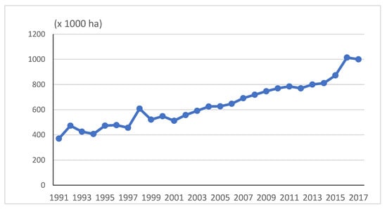 Rice acreage (ha) in South Sumatra (1991–2017). Source: Ministry of Agriculture, Indonesia.