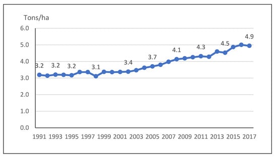 Rice productivity in South Sumatra, 1991–2017. Source: Ministry of Agriculture (https://aplikasi2.pertanian.go.id/bdsp/id/komoditas accessed on 31 March 2022). [].