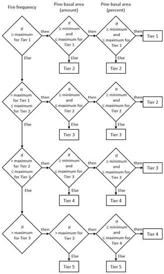 An ecological condition class (ECC) model was developed to estimate the stand-level forest condition as it relates to reference ecological conditions. As with other models that characterize landscape condition (e.g., [8]), the ECC model is data-driven, and uses logic to develop inferences about ecological integrity. However, in contrast to other models, the ECC model was developed to operate at a fine scale (stand-level, where stands average 14.6 ha), using local knowledge and readily available spatial data. Environmental models are of value to society to assist in the comprehension of complex ecological systems that have distinct spatial dynamics [38]. The ECC model we describe is an attempt to represent real-world ecological conditions through the manipulation of spatial information across a broad scale (93,694 ha) and the creation of a mathematical analogue. The model was decomposed into different elements that were considered important in describing ecological condition. The ranges of the corresponding appropriate values of these elements to ecological condition were based on local knowledge of the system, and six potential ecological condition classes (Tiers) were assigned to each stand. Given this, the ECC model could be characterized as a problem-specific, hierarchical, binary process model that integrates knowledge to evaluate environmental systems [38,39]. The outcomes of the model are class values, essentially a yes or no answer as to whether a piece of land falls within a certain ecological condition class. Logical expressions (i.e., if-then-else statements) within a hierarchical system are used to select the appropriate condition class from the data. For example, the ECC model allows the user to determine a range of fire frequencies and basal area estimates (Figure 2) to determine which ecological condition class a stand may fall within. This implies that a piece of land, given all of the criteria employed, will be assigned to one condition class, regardless of its stature within the different classes (i.e., one class may suggest a higher Tier, while another suggests a lower). The ECC model has other general characteristics. For example, the model uses existing conditions to express or predict current ecological condition, yet does not predict into the future what these conditions might be, which would require integration with a forest growth and yield model, and a model to simulate future management activities. The ECC model is also purely deterministic and contains no stochastic processes. Further, the ECC model does not emphasize any potential interactions among the various input data. Finally, the ECC model is also considered to be inductive, as results are obtained from empirical data and field observations [39]. In one sense, the ECC model is theoretical, as it is based on proposals of landscape processes that influence ecological condition and, based on these relationships, a hierarchical mathematical system is developed to assign the class values to the various pieces of the landscape [40].