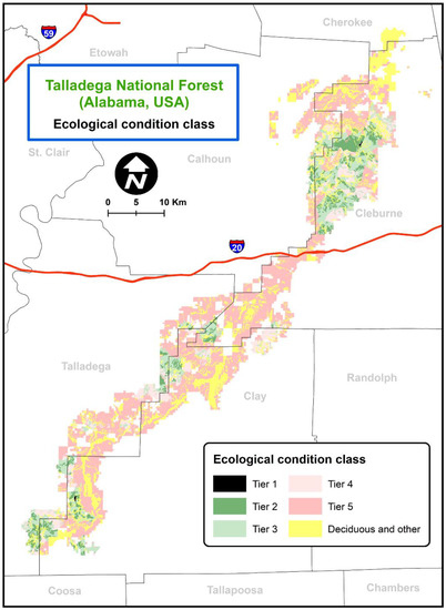 The desired future conditions of the Talladega National Forest focus on maintaining and restoring forest health [9,11,36,37]. The desired conditions focus on the development of a mosaic of forest stands with variable-sized openings in the forested canopy. The desired pattern of vegetation ideally would resemble the footprint of natural disturbances, as they are currently understood. In transforming the current landscape to these desired conditions, certain outcomes (timber products) are by-products of management activities designed to meet other resource objectives (e.g., those related to wildlife habitat, old growth, and forest health). The ecological condition classes described here represent the conceptual distance in ecological status that each forested area is away from optimum conditions. The estimation of ecological condition class can inform managers of those places across the landscape where restoration activities are necessary to achieve desired future conditions, as well as those areas that are of the desired condition and should be maintained. The model outcomes can account for planning and progress towards the desired future conditions if used consistently when management actions or disturbances occur on the landscape.