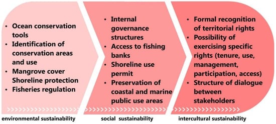 While biodiversity conservation is a necessity to ensure the structure and functionality of ecosystems [], it must always be linked to the needs of local stakeholders and their historical or circumstantial relationship with areas affected by protected area declarations []. In the follow-up to SDG 14, the seas and marine resources are recognised as a key indicator insofar as the oceans cover three-quarters of the Earth’s surface, support 5% of global GDP, directly and indirectly generate nearly 200 million jobs and, therefore, have the potential to contribute to food security [].