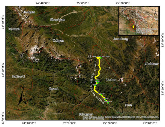 Location map of the National Highway NH-44 stretch studied in this paper. The upper right inset is its location with reference to the UT of Jammu and Kashmir, India. The red outlines are the districts of the UT of J and K. The green dots on the National Highway are the prominent landmarks as well as the sampling points. The map coordinates are in the UTM 43 (North) World Geodetic System (WGS-1984) reference system.