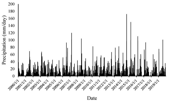 Daily mean precipitation of the study area from 2000 to 2020 based on the Tropical Rainfall Monitoring Mission (TRMM) data.