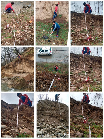 The distance to the road and the distance to the river, which can influence slope stability, were obtained using the base map services from ArcGIS 10.4.1. Some sites were measured manually with measuring tape, as shown in Figure 4. The landslide inventory of the study area was obtained from (Global landslide catalog) svs.gsfc.nasa.gov (accessed on 1 December 2021) and from local sources (newspapers, social media, and online news reports). Some soil characteristics and threshold values were derived from Fayaz and Khader (2020) [41]. The same threshold values were used to predict landslides using machine learning methods (algorithm). Slope angle data were obtained using a mechanical tool inclinometer and a Digital Elevation Model (DEM) generated from stereo SRTM DEM. The rainfall data were divided into four categories for better model predictions and accuracy: (i) 0–20 mm as ‘1’, (ii) 21–40 mm as ‘2’, (iii) 41–100 mm as ‘3’, and (iv) a 3-day antecedent rainfall above 50 mm as ‘4’. The area-average of the root zone soil moisture in kgm2 was obtained from NASA (giovanni.gsfc.nasa.gov (accessed on 01 December 2021)) using [GLDAS Model GLDAS_CLSM025_D V2.0]. The built-up area near the landslide spots was measured and calculated using ArcMap 10.4.1. The structures (construction) surrounding each landslide-prone site were mapped with ArcGIS Basemap services and measured in square meters. Table 1 shows the sources of the data used in the present study.