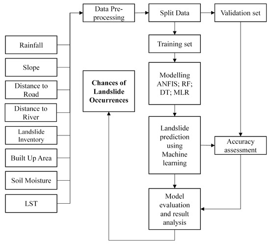 In this paper, a landslide prediction model was designed using various machine learning algorithms. The algorithms used were Multiple Linear Regression, Adaptive Neuro-Fuzzy Inference System (ANFIS), Random Forest, and Decision Tree; the model accuracies were compared to determine the optimal prediction system for landslides. The application of these models in landslide engineering has been discussed in detail by Fayaz and Khader (2020) [41]. The overall methodology used in the present study is shown in Figure 5.