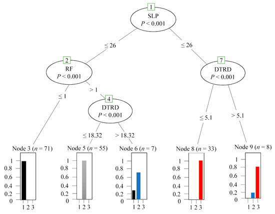The data were divided at the first node (SLP), which, according to the DT, is a highly significant and highly contributing attribute to the overall model. The data at the first node were split into two groups, data with an SLP value less than or equal to twenty-six and data with an SLP value greater than twenty-six. Data with an SLP value greater than twenty-six were then distributed into two on the basis of the DTRD (Distance to Road), whether the data point was less than or equal to 5.1 or greater than 5.1. If it was less or equal to 5.1, then the chances of a landslide were relatively high. If the value was greater than 5.1, then there would be an 80% chance of a landslide, which was considered as a medium level warning. Likewise, if the SLP was less than or equal to twenty-six, then the data were checked for Rainfall (RF) at another level, which was also a highly contributing variable. If the value of the RF was less than one, which is 0–10 mm, then the chance of a landslide was ‘1’, which was low, while if the value was greater than one, the data were checked for DTRD. If the DTRD value was less than or equal to 18.32, then the chance of a landslide was ‘2’, which was a mid-level warning. If the value of DTRD was greater than 18.32, then there was a nearly 30% chance of a level 1 (Low) warning and a 70% chance of a level 2 (Mid) warning. The model was composed of five terminal nodes (response nodes), seven input variables, and a single response variable (LC) for the prediction of landslides. The overall accuracy of the model was calculated using a confusion matrix, which provided a holistic view of the model. The model showed an overall accuracy of 95.7% for the testing data and 98.3% for the training data. So we can say that this model is suitable for the classification of landslide chance occurrences based on various essential and highly significant factors (variables).