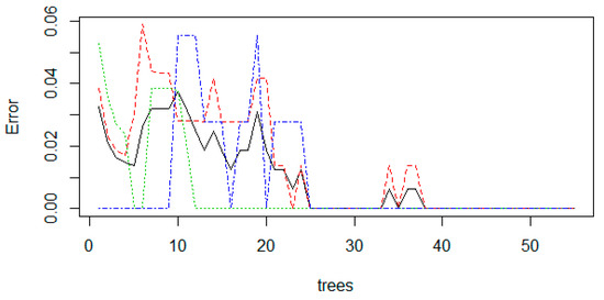 The confusion matrix evaluated for the model showed 100% accuracy, which we can consider as the best model for predicting landslide type problems. The experiments were carried out using two approaches known as hold out and cross-validation. In holdout, the data were portioned into two partitions (independent data sets). Here, 75% of the data was used to train the model, and the remaining 25% was used to test the model for accuracy. The cross-validation approach was used to find the best model and the best accuracy among the various models and methods utilized for future prediction. The default RF model was tuned using the “tuneRF” function in R-Programming to decrease the model’s error rate, which was initially around 0.276 at ntree = 20 and mtry = 2 and dropped to zero at ntree = 55 and mtry = 2. The OOB error visualization is shown in Figure 7.
