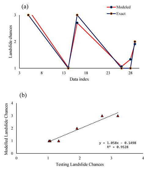 The predicted vs. observed data values are shown in Table 6 and Table 7, respectively, while the graph in Figure 9a shows the predicted and observed data values graphically, which were highly identical and similar. Figure 9b, shows the high R2 between the modelled and predicted landslide chances using the MLR model.