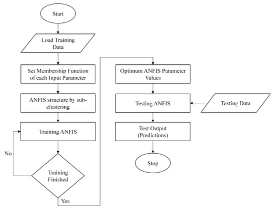 ANFIS has five layers: one input layer, three hidden layers, and a single output layer, excluding an input layer (layer 0) [54]. The inputs are fuzzified at the first layer, where each node uses a ‘trimf’’ function to evaluate a membership value for a linguistic term. The ‘trimf’ membership function was used for the input variables, since it showed a lower training and testing error than the other membership functions. The second layer multiplies the output from the first layer with a single factor, which performs min. (AND) operation. The firing strength of the rule is perceived by multiplying the membership values, which are denoted as μA_i (v_0) and μB_i (v_1), where a variable v_0 has a linguistic value of A_i and v_1 with B_i as a linguistic value in the antecedent part of Rule i, estimated using (Equation (2)). The third layer with’p’ nodes normalizes the output of the second layer and generates the output as normalized firing strengths, which are calculated by dividing the strength of each node’s node rule firing strength by the total strength of all firing rules, shown as Equation (3). The fourth layer obtains the normalized firing strength as the input and generates the first-order polynomial as the output. In this layer, every node calculates a linear function where the multilayer feed-forward mechanism of the neural network is used to adjust the function coefficients, shown as Equation (4). The fifth layer of the ANFIS adds every incoming signal and provides the final output evaluated using (Equation (5)).