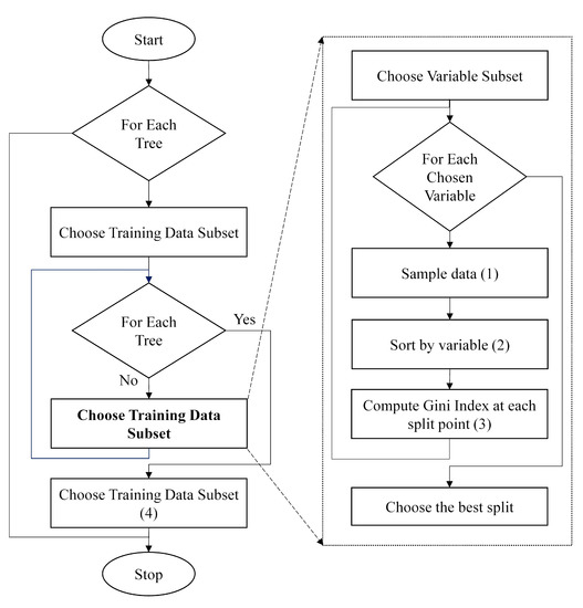 A supervised learning technique based on a principle of ensemble learning contains ‘n’ number of decision trees on different subsets of the given dataset, which increases the predictive accuracy of the dataset [56]. Based on the output of each tree and the majority prediction votes, it predicts the final output. The decision tree can also be used for various machine learning applications, but the biggest drawback of the decision tree is the overfitting of training data [57]. Overfitting occurs when the trees are grown deeply to learn highly irregular patterns in the data. Random forest overcomes this limitation through the creation of multiple trees on various subspace areas at the cost of significantly reduced bias [58]. There are many other benefits to using RF approaches, for example, outliers or missing data can be ignored, data transformation and rescaling are not essential, and RF can handle both categorical and numerical data [59]. The RF model was developed using the ‘random forest package’ in the RStudio environment.