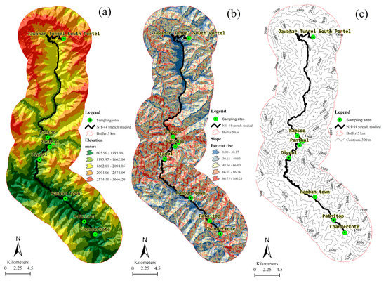 The study area is shown in Figure 1 and is located between the Ramban and Banihal district of Jammu and Kashmir, belonging to the northern Himalayas with an altitude of 495–4510 m above sea level. The area covers an area of 401 Km2 and extends over a distance of 65 km from the Jawahar Tunnel to Chandarkote. Such regions in India are known to be highly vulnerable to landslides [36], since many landslides have occurred in the past, and more than ten highly significant and devastating events occurred between December 2020 and January 2021. The area has hilly topography with an average altitude of 2044 m above mean sea level, making it an area highly prone to landslides.