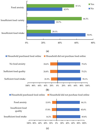 Distribution of online food purchase in relation to three different aspects of household food insecurity: (a) prevalence of household food anxiety, food quality, and food intake; (b) online food purchase by households with adequate food quality and intake and no anxiety about food supply; and (c) online food purchase by households with insufficient food quality and intake and with anxiety about food supply. Source: Authors’ own compilation.