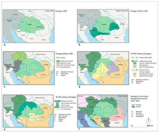 After the conquest (896), Hungarian history can be divided into several periods and this division is important for the historical, economic and social aspects of the region. Figure 1 shows the most important historical periods of the Kingdom of Hungary and, in this context, of Transylvania. According to this historical division, until the collapse of the Austro-Hungarian Empire the most significant and prosperous period of the kingdom was the third period (Figure 1c), which started after the Mongol Invasion of 1241, and lasted until the Battle of Mohács in 1526. During this period, the medieval Kingdom of Hungary became a regional power; its position in international policy was the most favourable possible and its internal legislative and administrative reforms reflected a fair spirit and a strong sense of justice [3,4,5].