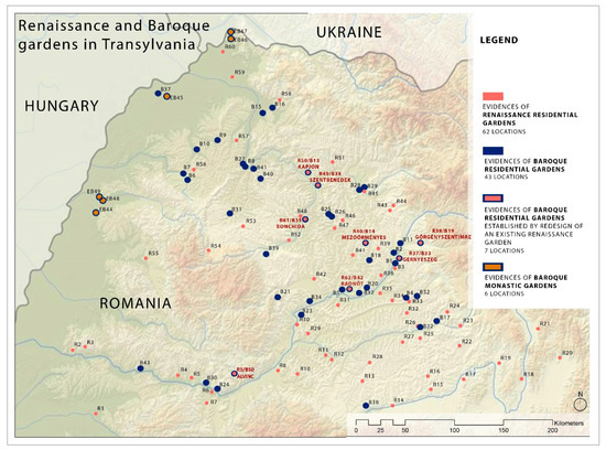 Spatial distribution of Transylvanian Baroque gardens and their relation to the pre-Baroque late-Renaissance Transylvanian garden art; the locations of the Baroque gardens marked on the map can be identified by the numbering assigned to them (B1–B50) using Table 2. Source: prepared by Albert Fekete.