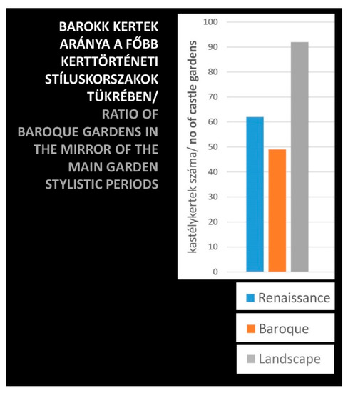 In the garden history of Transylvania, the Baroque style was almost one hundred years late in spreading compared with other parts of Europe. In terms of the number of gardens in Transylvania, the Baroque cannot be called the leading garden style in this part of the country. The number of Baroque gardens is much lower than the number of earlier Renaissance or later Landscape Gardens (Figure 10). This is a consequence of the forced political and economic dependence of Transylvania in the 18th century.