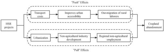 As shown in Figure 1, the “pull” effect of the HSR projects improves non-agricultural industrial development and promotes urbanization in HSR-linked regions. Specifically, urbanization is the process of transforming rural agricultural communities into urban communities based on industry [] by occupying farmland for urban development or encouraging rural workers to abandon their farmland to seek better non-agricultural opportunities [,]. As the HSR interconnected regional network structure promotes logistics, there are also additional opportunities for industrial development in small or medium-sized cities, which again encourages increased urbanization []. Therefore, as the HSR network has led to significant changes in regional industrial and factor input structures, there has been a commensurate increase in the labor and service markets in HSR connected cities [], which has motivated rural workers to abandon cropland and seek better lives in non-agricultural industries []. Because of the constraints in the existing Chinese land system, the agricultural land property rights trading market is not perfect, which has also led to out-migration by rural workers to non-agricultural industries [,].